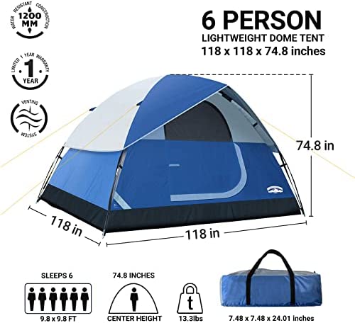 Pacific Pass 2/4/6 Person Family Dome Tent with Removable Rain Fly, Easy Setup for Camp Outdoor